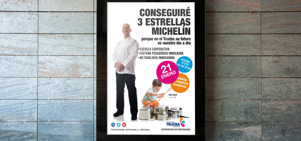Colegio Trueba Prepara hoy a los niños del futuro. La campaña de La Central Badiola se desarrolló en base a que el Colegio Trueba prepara hoy a los niños del futuro. Para promocionar el día de puertas abiertas del Colegio Trueba e incentivar las matriculaciones para el nuevo curso, se realizaron: cuñas de radio, anuncios en prensa, carteles y flyers, se vinilaron autobuses, se realizó una acción de street márketing y fueron colocados oppis en el metro.