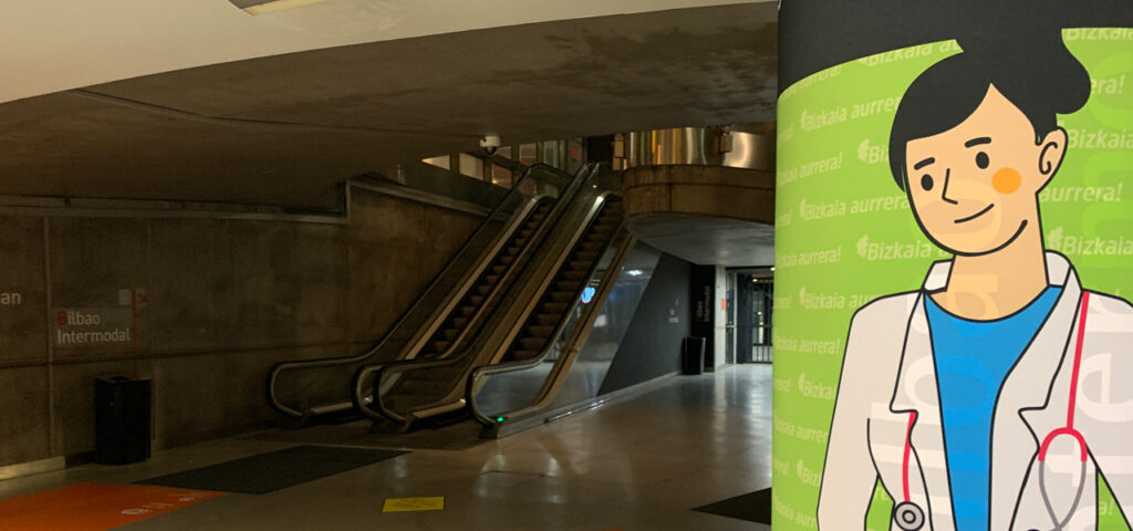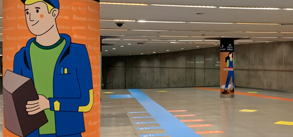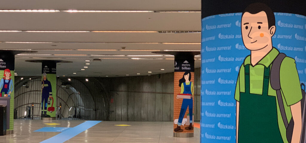 Realizamos en La Central Badiola, un diseño basado en ilustraciones propias de diferentes profesiones esenciales y cubrimos las columnas del hall de la estación de San Mamés (Bilbao) sin olvidarnos de incluir en el diseño la señalética de la Intermodal.