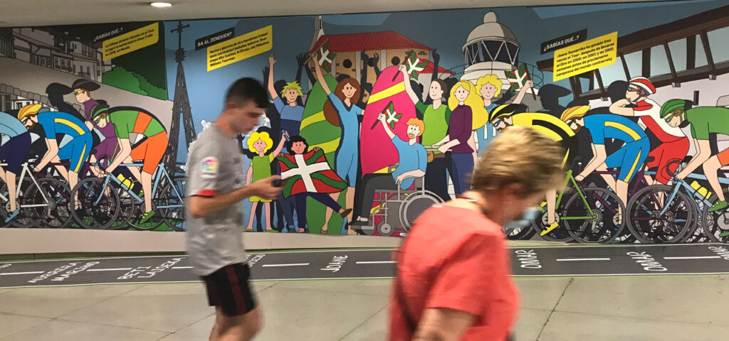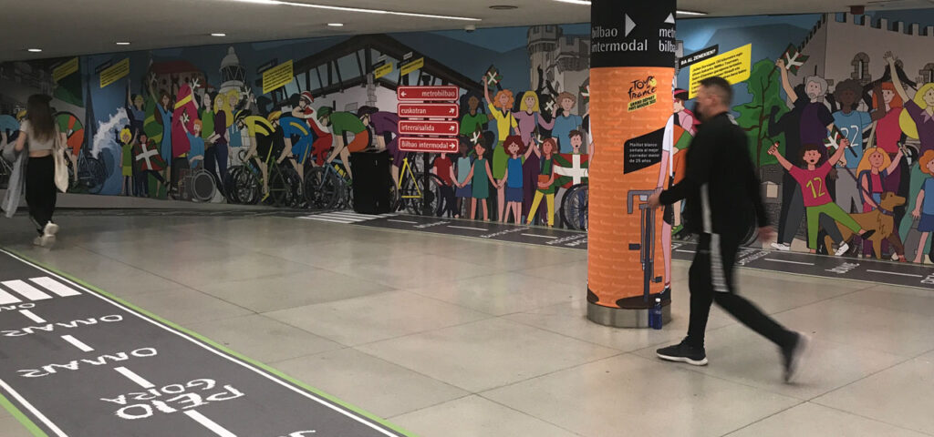 La obra cubre tanto el suelo como las paredes de la estación con paneles, donde los ciclistas parecen recorrer el espacio mientras el público los anima con energía. Cada rincón invita a revivir la emoción de la etapa, convirtiendo el hall en una ventana al corazón de Bizkaia, lleno de vida y movimiento.