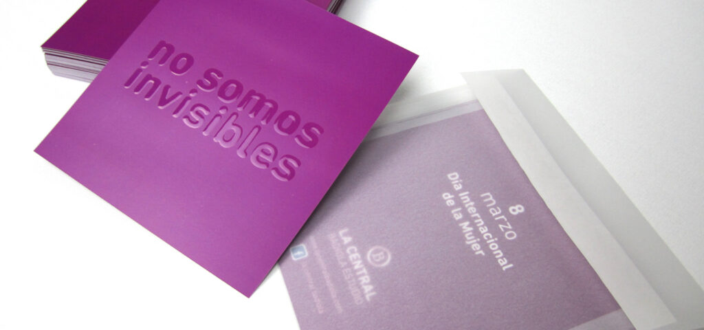 Al recibirlo parecía ser un tarjetón morado, pero a medida que se extraía del sobre se podía leer “no somos invisibles”. Con la intención de reivindicar una mayor visibilidad de la mujer en nuestra sociedad. Realizado con una técnica en UVI con 3D para crear esa sensación de cierta invisibilidad.