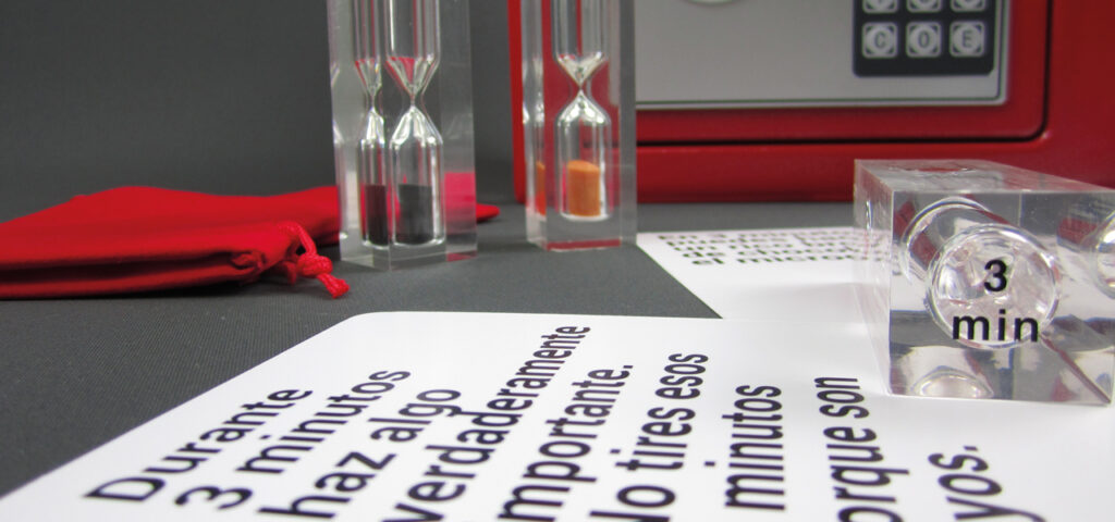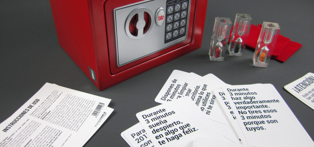 Regala tiempo. Este año Dt Creativos quiso regalar lo más valioso que tenemos a sus clientes: el tiempo. Por eso les obsequió con un reloj de arena de 3 minutos metido en una caja fuerte y unas tarjetas con múltiples posibilidades para usar ese tiempo. Desde La Central Badiola ideamos y dimos forma a la idea.