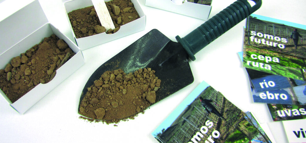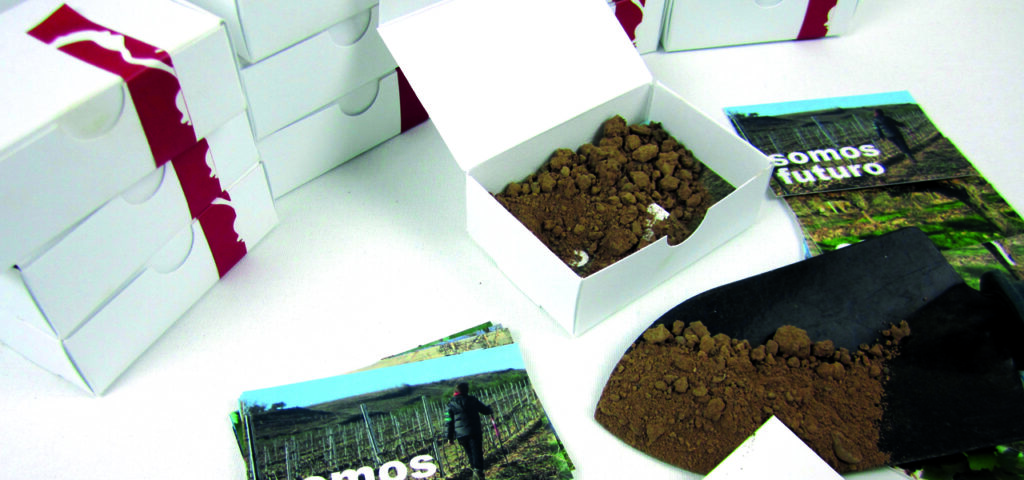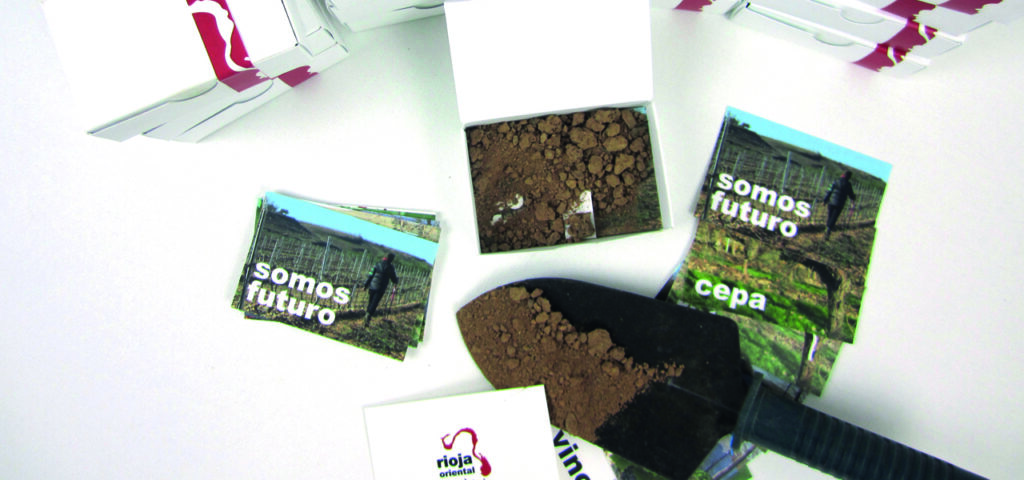 Para la presentación de la ruta del vino realizamos en La Central Badiola, tarjetas con el desarrollo del diseño de la marca de la ruta. Llenamos unas cajitas con las tarjetas y las cubrimos con tierra de la zona, ya que la marca corporativa «surge de la misma tierra». Tambíen se usaron las cajitas como regalo para los presentes en la presentación de la ruta en Fitur.